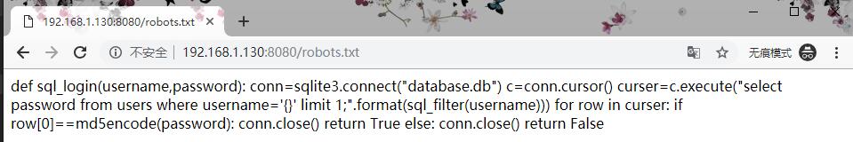 - robots.txt中是网站登陆认证逻辑的源码,可以看出后算是使用python编写,数据库为sqlite。并对用户输入进行了过滤。